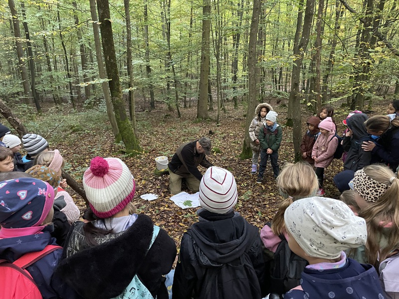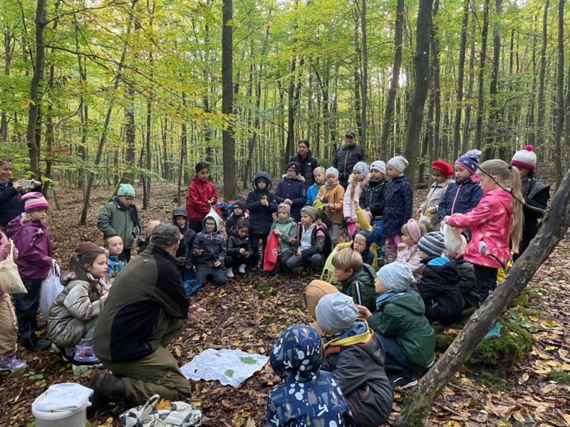 Am Freitag, dem 10. Oktober 2025, unternahmen die Klassen 2a und 2b einen spannenden Lerngang in den Wald. Vor Ort begrüßte der Förster Herr Schiz die Kinder und führte sie abseits der Wege durch das Gelände. Auf ihrer Entdeckungsreise erreichten sie eine kleine Lichtung, wo sie verschiedene Naturgegenstände wie Bucheckern, Eicheln und Blätter sammeln sollten. Zurück bei Herrn Schiz überlegten die Kinder gemeinsam, welche Baumarten hinter den gesammelten Objekten steckten. Besonders die gefundenen Eicheln, welche bereits austrieben, faszinierten.