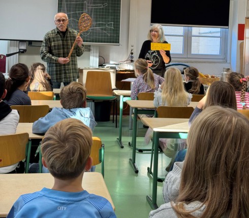 Die Drittklässler der Grundschule Öschelbronn haben sich in den letzten beiden Wochen dem Thema angenähert. Es wurden Wörter gesammelt und übersetzt sowie Texte in Mundart gelesen. Außerdem besuchte das Mundart-Künstlerpaar Rosie und Wolfgang Müller aus Söllingen die beiden Klassen, um als Oma und Opa von früher zu erzählen. Zahlreiche Gegenstände halfen dabei, sich den Wortschatz einzuprägen. Die beiden hatten beispielsweise ein „Veschberbreddle“ im Gepäck. Auch ein „Batscher“ für „Debbiche“ durfte nicht fehlen. Der wurde früher auch gelegentlich für andere Zwecke verwendet. Schiefertafel samt Griffel, Schwamm und selbst gehäkeltem Lappen waren dabei.