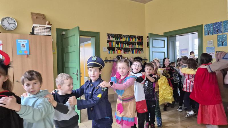 Pünktlich zur Pause wurde eine fröhliche Polonaise durch das Schulgebäude gestartet. Alle Klassen zogen lärmend und lachend durch die Flure und Zimmer, während Frau Luciano die passende Musik dazu abspielte.