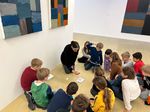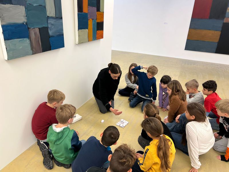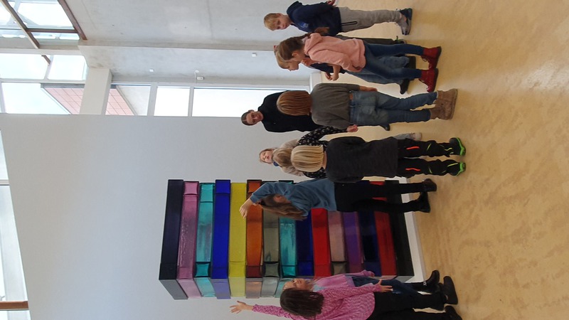 Im November haben die beiden dritten Klassen der Grundschule Öschelbronn die Ausstellung: Sean Scully im Kunstwerk in Nussdorf besucht. Frau Waibel, die Museumsleiterin, begrüßte uns und wir haben sofort das erste Bild, das im Eingangsbereich hängt, angesehen und besprochen: Farben, Muster, Material, Aufbau. Die Kinder waren mit guten Äußerungen und Ideen dabei. Weiter ging es zu einer Skulptur, die der Künstler aus farbigen Glasbausteinen aufeinander geschichtet hatte. Diese Skulptur begeisterte die Kinder ganz besonders. In der 1. Ebene wurden dann drei Werke des Künstlers genauer betrachtet und die Kinder versuchten, den Aufbau des Bildes mit eckigen Papptellern nachzubauen. Dies war dann auch der Grundstock für die Arbeit im Malkeller. Dort wurde mit Streichholz- schachteln gearbeitet. Mit zwei Grundfarben sollten die Schachteln bemalt, und es mussten neue Farben ermischt und aufgetragen werden. Das Ergebnis dieser Arbeit ist auf dem Gruppenbild zu sehen.