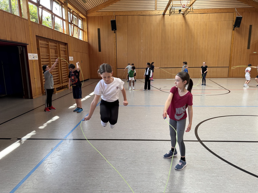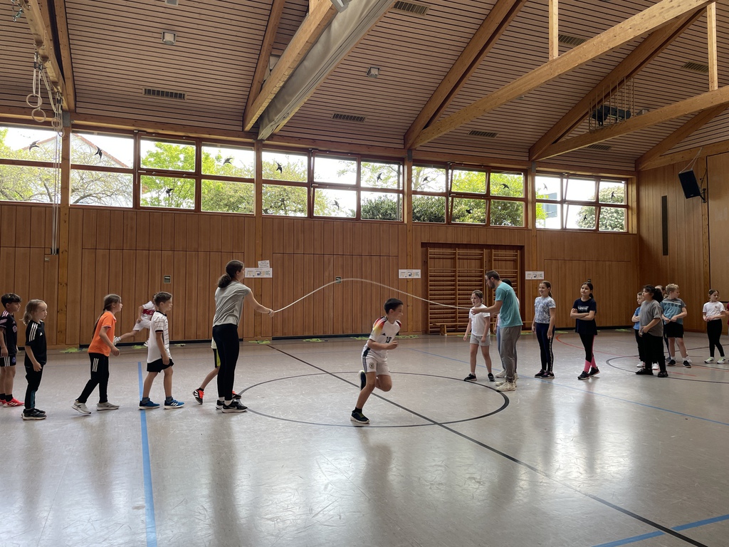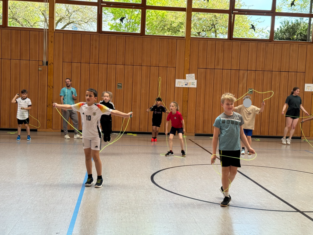 Ein besonderes Highlight war die abschließende Aufführung, bei der die Kinder ihr neu erlerntes Können vor ihren Eltern sowie den Drittklässlern und Drittklässlerinnen präsentieren konnten. Die Begeisterung war groß, und die Zuschauer waren beeindruckt von den kreativen Sprüngen und Choreografien.