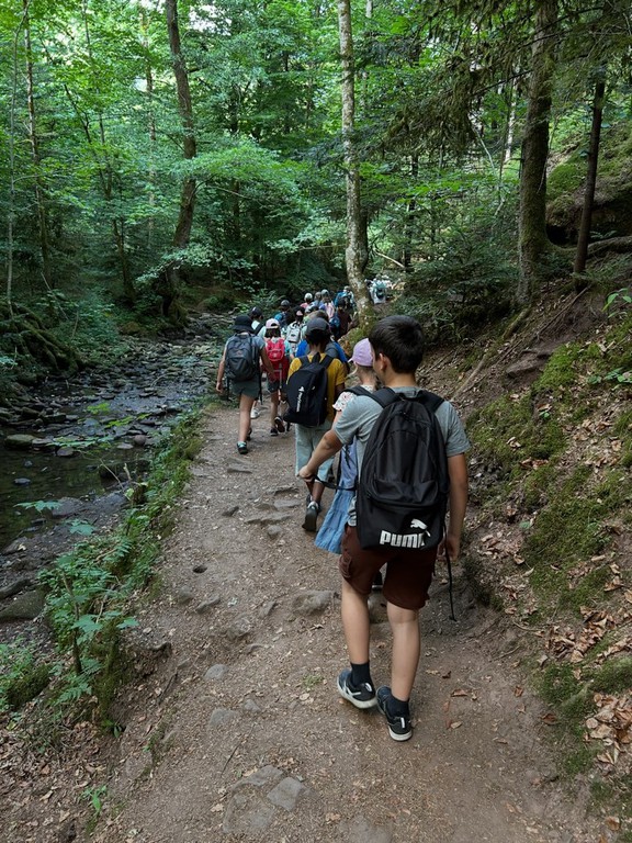 Bei strahlendem Sonnenschein machten sich die Kinder, begleitet von ihren Lehrerinnen auf den Weg. Über Stock und Stein, vorbei an moosbedeckten Felsen und plätschernden Bächen, ging es durch die wilde Natur. Auch wenn der Weg teilweise rutschig und herausfordernd war, meisterten alle Kinder die Wanderung mit Bravour.