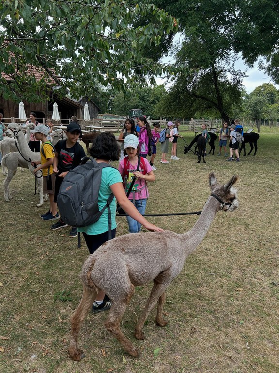 Ein weiteres Highlight wartete am zweiten Tag: die Alpakawanderung. Zu zweit durften die Kinder jeweils ein Alpaka führen – mit viel Geduld, aber auch jeder Menge Spaß. Die Tiere mit ihrem sanften Wesen eroberten die Herzen der Kinder im Sturm. Im Anschluss an die Wanderung gab es noch „Alpakaspucke“ zu trinken. Die erfrischende Holunderblütenschorle schmeckte allen hervorragend. Abends wurden im gemeinsamen Gruppenraum Spiele gespielt und ein Discoabend rundete das Erlebnis ab.
