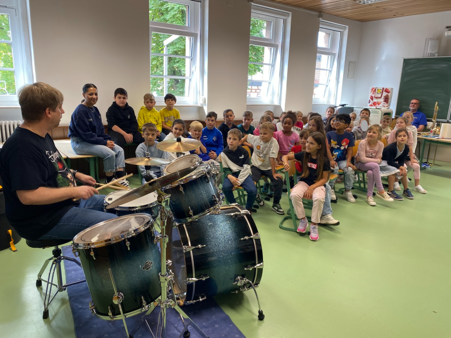 Jeden Donnerstag erfüllt Rhythmus den Gymnastikraum unserer Grundschule, denn dann trifft sich unsere beliebte Trommel AG der Musikschule Los Trommlos von Ulli Baral. Schülerinnen und Schüler der Klassen 1 bis 4 kommen hier zusammen, um gemeinsam die Welt der Percussion zu entdecken. Im Mittelpunkt steht dabei oft das Cajon, eine vielseitige Kistentrommel, die den Kindern besonders viel Freude bereitet. Aber auch Anderes kommt zum Einsatz: Rasseln, Shaker, Klanghölzer und natürlich die bei allen beliebten Schweinchen und Rasseleier sorgen für klangliche Vielfalt.
